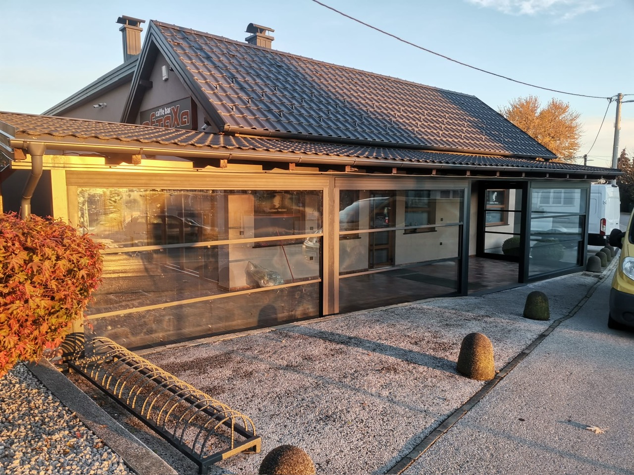 Staklene giljotine izrađene su od kaljenog stakla 4/12/4 mm i pokreće ih motor, što omogućuje lako otvaranje i zatvaranje. One štite od vremenskih uvjeta, zadržavaju otvoren pogled i stvaraju ugodan prostor za boravak tijekom cijele godine.